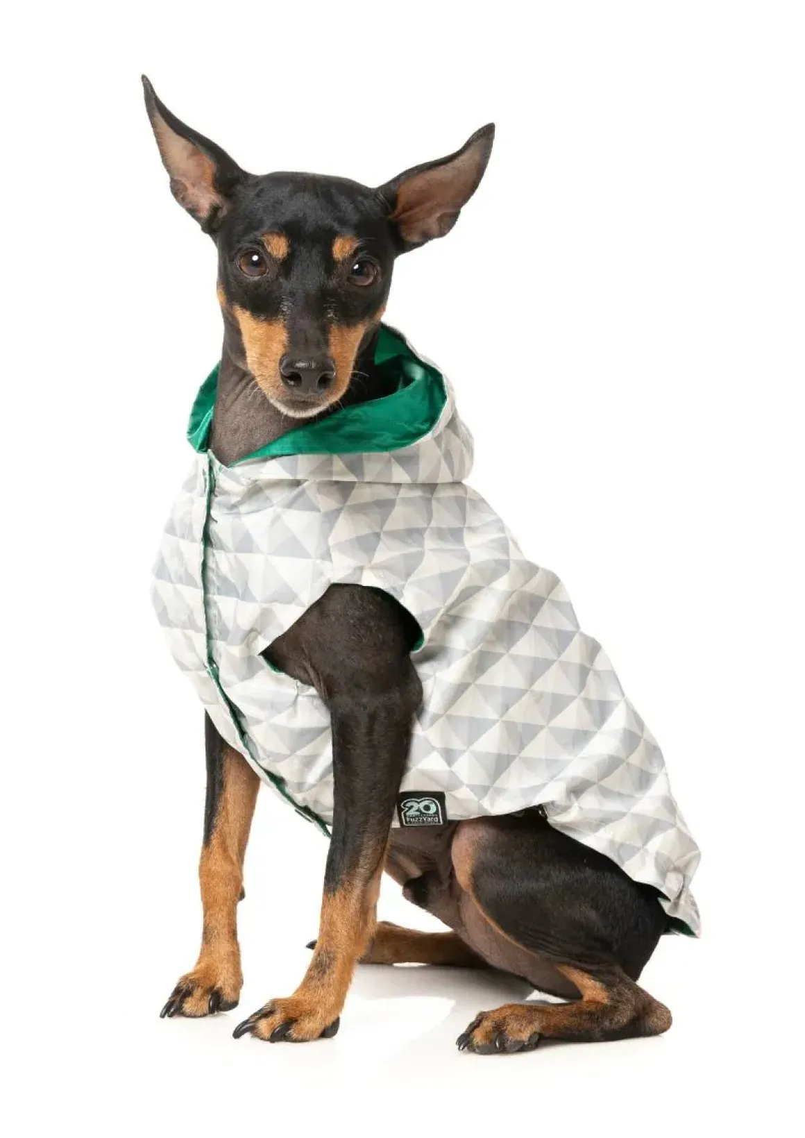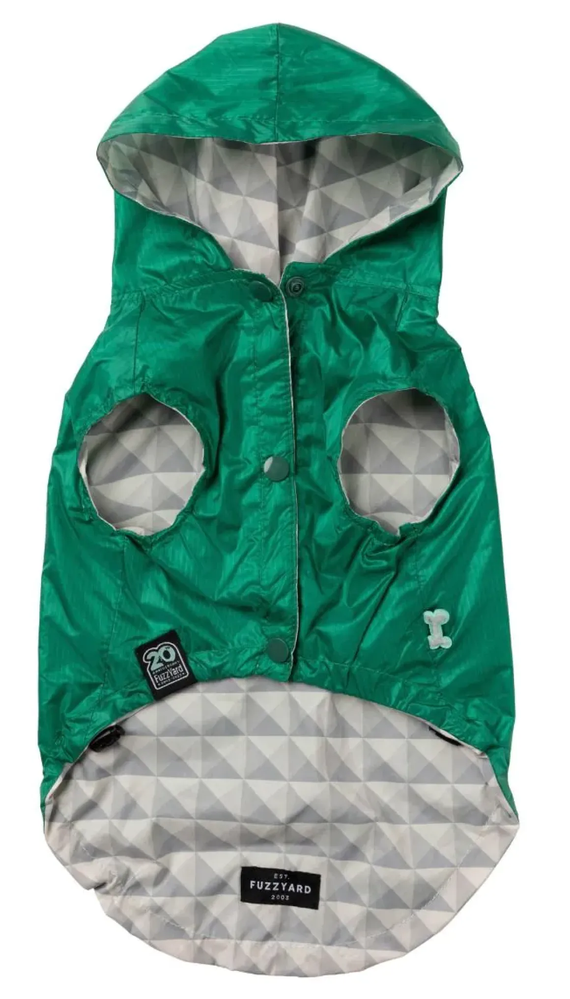 Let’s throw it back to the ’90s with this vintage-style Flipside windbreaker raincoat by FuzzYard. This water-resistant, lightweight, sleeveless jacket is perfect for those rainy days. It features a reversible design with block color on one side and a geometric pattern on the other. The front chest snap buttons are excellent for easy closure and wearability, and an added harness hole means your pup can easily wear their harness underneath.