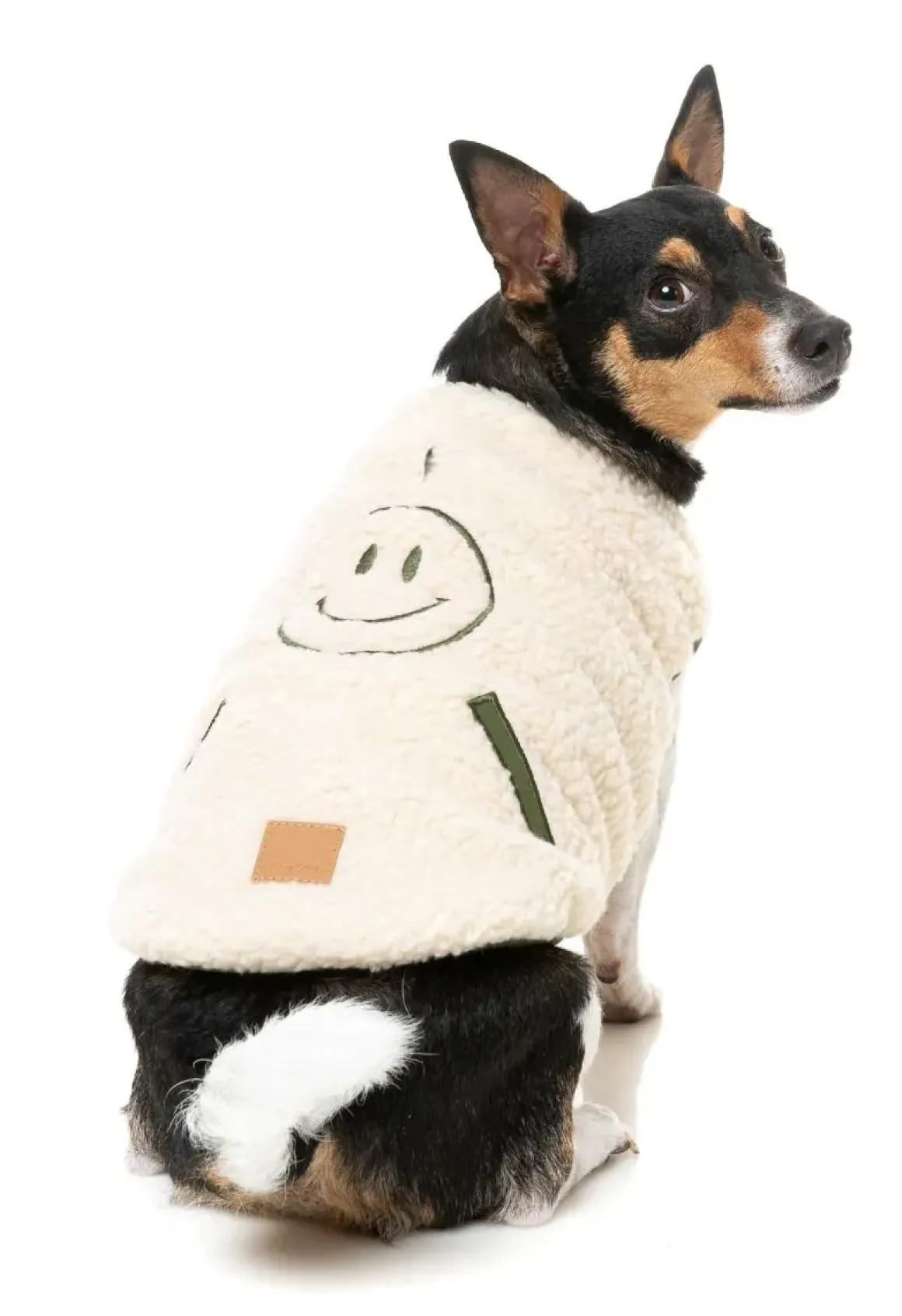 Side 1 is made from a thick sherpa material and includes an embroidered smiley face in a contrasting color. Faux pockets add extra style to this piece. This side is perfect for those rugged vibes.