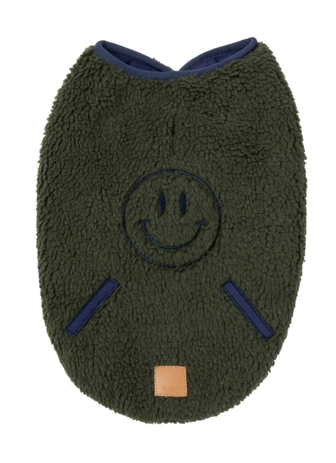 Side 1 is made from a thick sherpa material and includes an embroidered smiley face in a contrasting color. Faux pockets add extra style to this piece. This side is perfect for those rugged vibes.