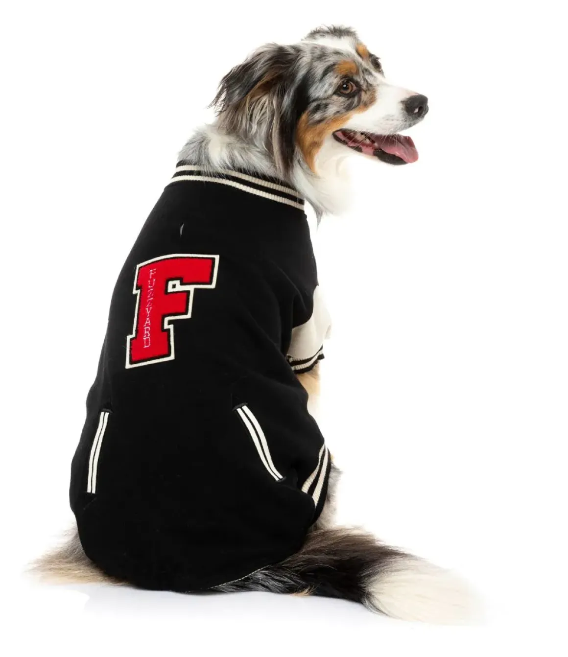This retro-style varsity jacket is made from a super soft and warm material with snap buttons on the chest. It features a red FuzzYard chenille patch, contrast sleeves with striped ribbed trims, collar and faux pockets. Your pup will be the most popular pooch at the dog park and will be the envy of the pack in the FuzzYard Letterman Jacket.
