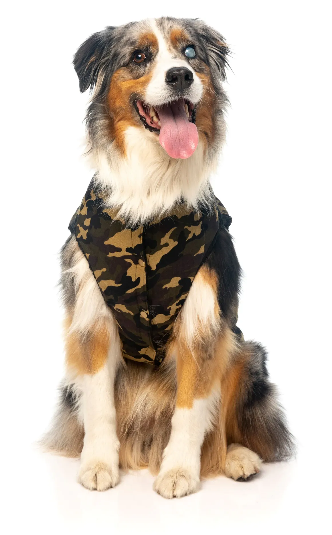 Your pup will go incognito in style with this camo print denim. Complete with black shearling-like trim, your pup can rock this look all year round!