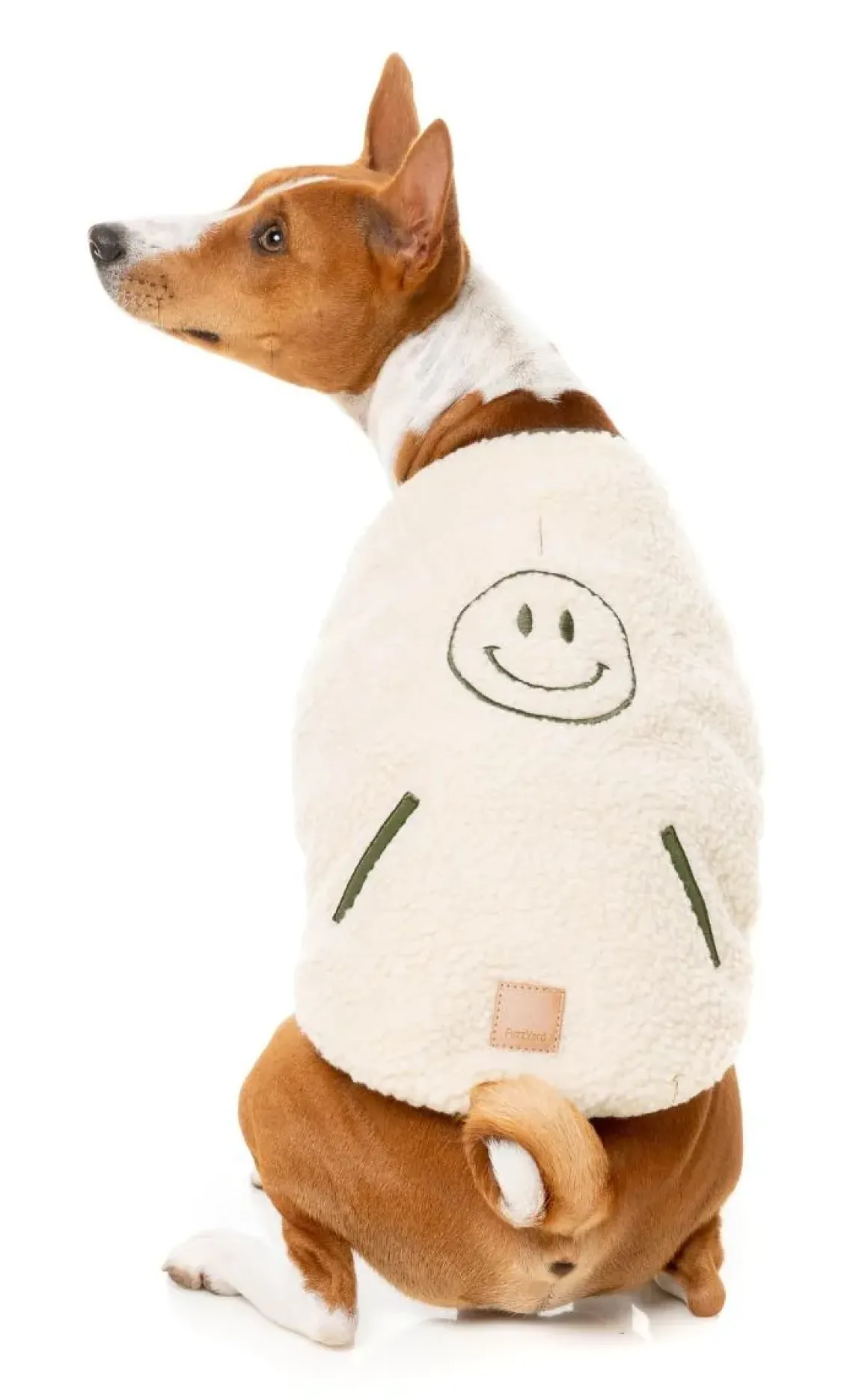 Side 1 is made from a thick sherpa material and includes an embroidered smiley face in a contrasting color. Faux pockets add extra style to this piece. This side is perfect for those rugged vibes.