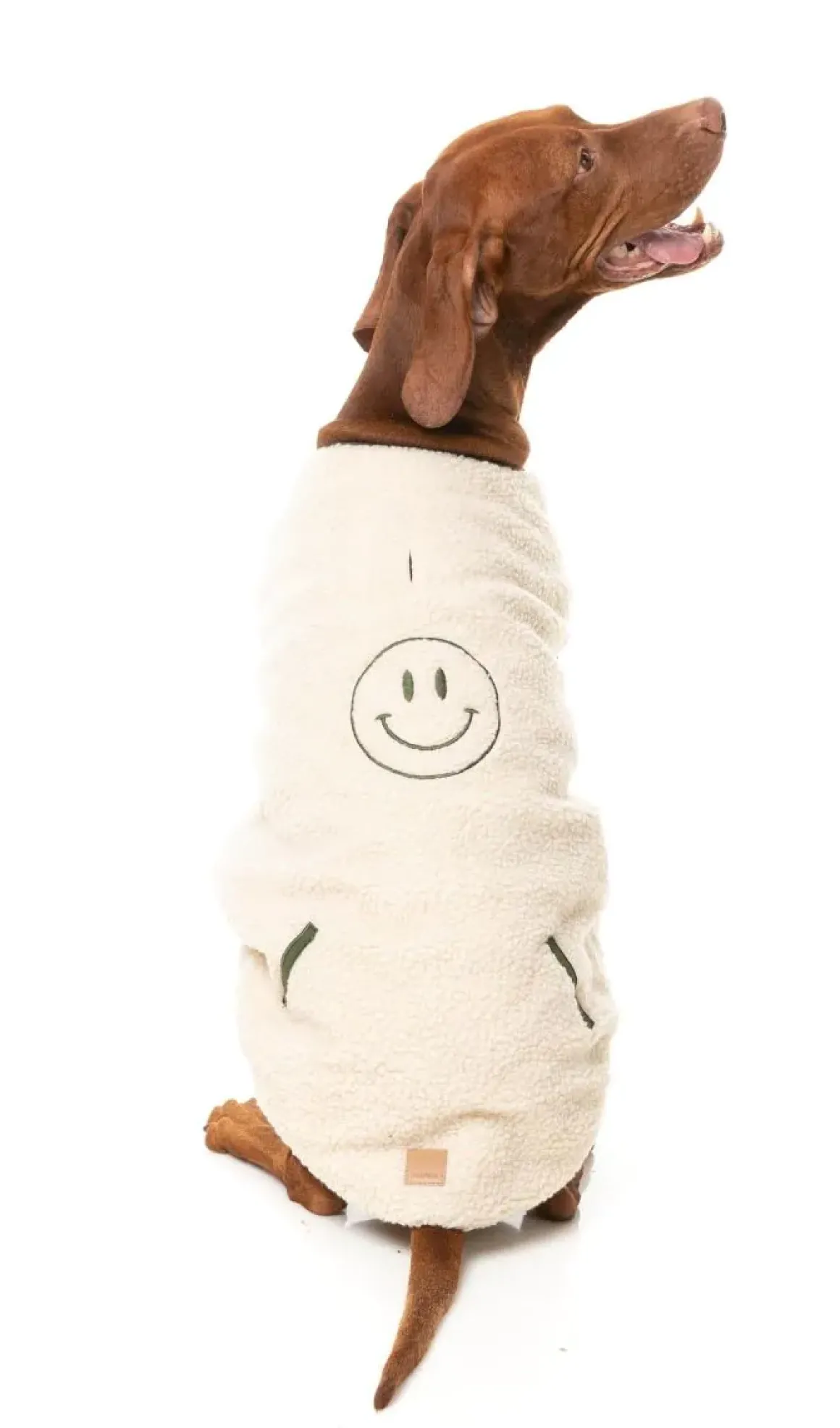 - Side one: Luxuriously thick sherpa material with embroidered smiley face and faux pockets