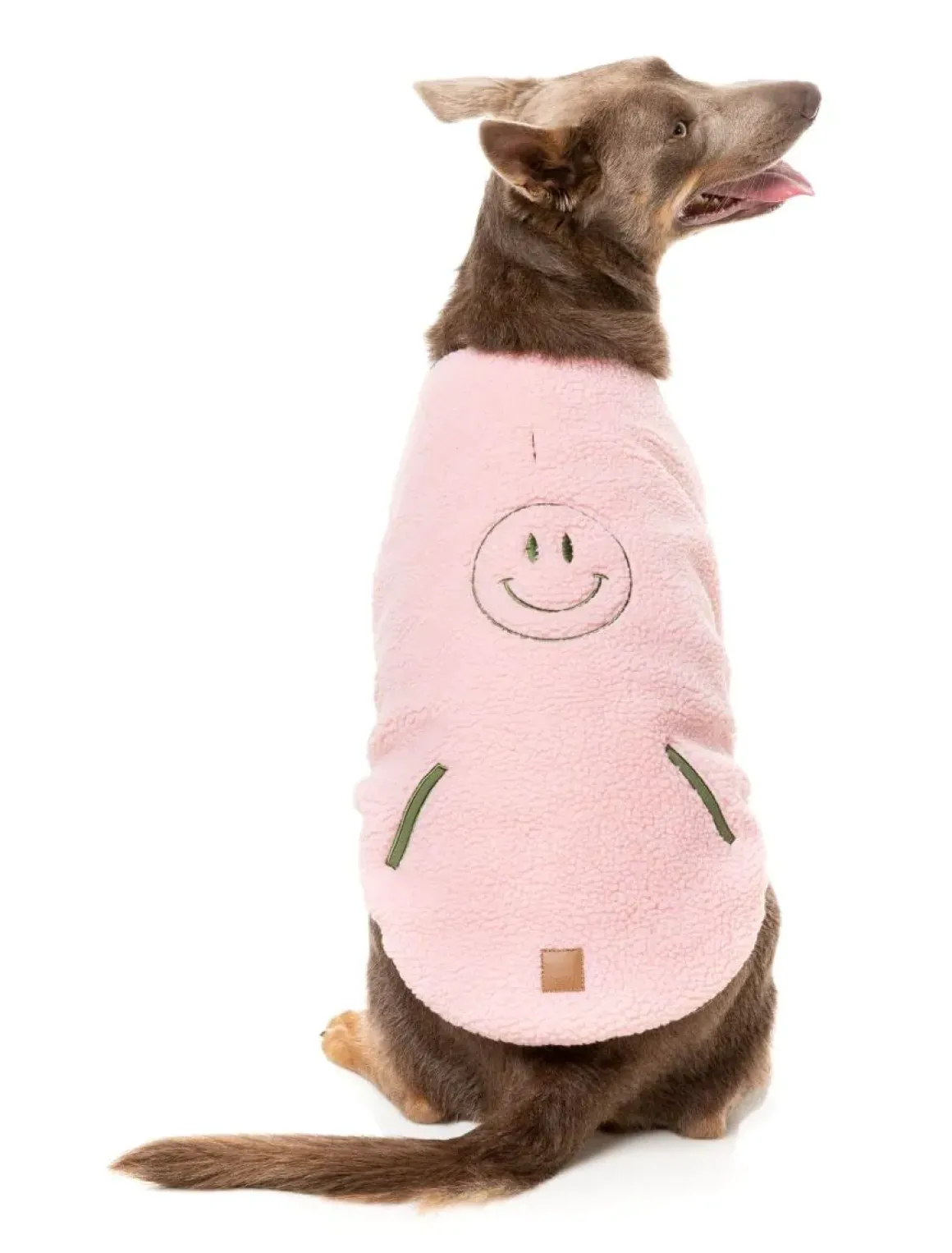 Side 1 is made from a thick sherpa material and includes an embroidered smiley face in a contrasting color. Faux pockets add extra style to this piece. This side is perfect for those rugged vibes.